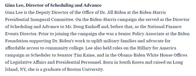 지난해 조 바이든 대통령 당선인 대선 캠프에 합류한 지나 리 씨는 모금행사 국장, 카멀라 해리스 부통령 당선인의 남편 더글러스 엠호프 변호사의 일정 관리 등을 맡았다.