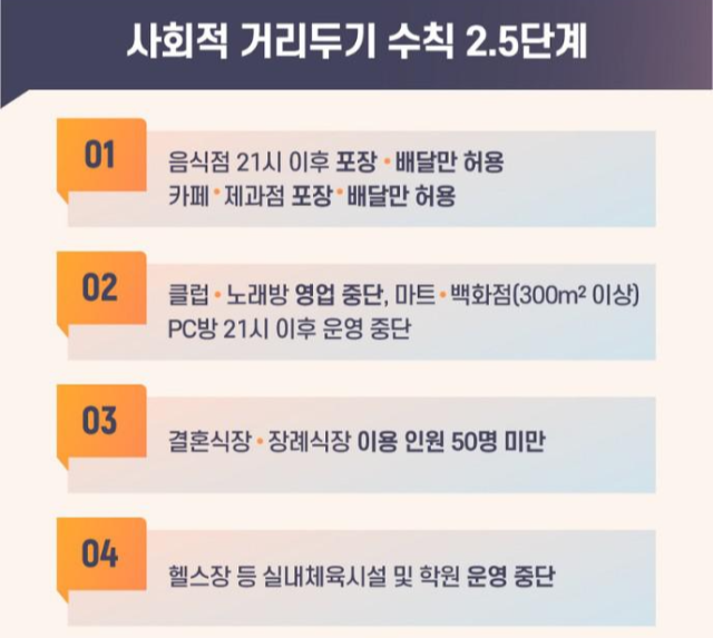 1. 수도권은 2.5단계, 비수도권은 2단계의 거리두기 단계를 2주간 더 연장