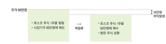 예를 들어 A종목을 갖고 있지 않은 투자자가 이 종목의 주가하락을 예상하고 매도주문을 냈을 경우, A종목의 주가가 현재 2만 원이라면 일단 2만 원에 매도한다. 3일 후 결제일 주가가 16,000원으로 떨어졌다면 투자자는 16,000원에 주식을 사서 결제해 주고 주당 4,000원의 시세차익을 얻게 된다.