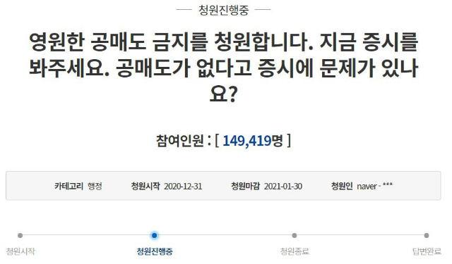 1월 들어 청와대 국민청원에는 공매도 재개를 막아달라는 청원글과 이에 동의하거나 지지하는 글이 잇따르고 있는데, 특히 지난해 말일에 올라온 ‘영원한 공매도 금지를 청원합니다’ 청원글에는 17일 기준 14만명 이상이 참여하고 있다.